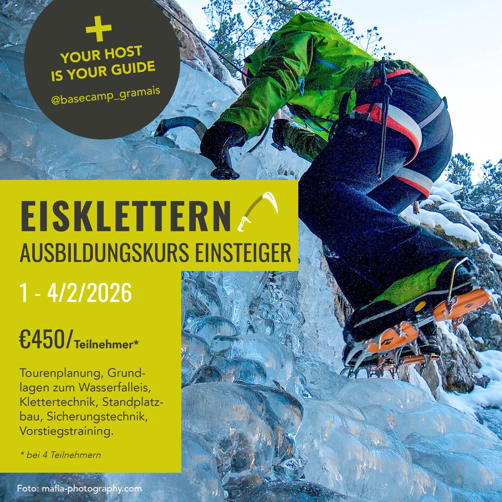 Das Basecamp Gramais ist keine 5 Gehminuten von unseren drei Übungs-Eiskletterwänden entfernt.