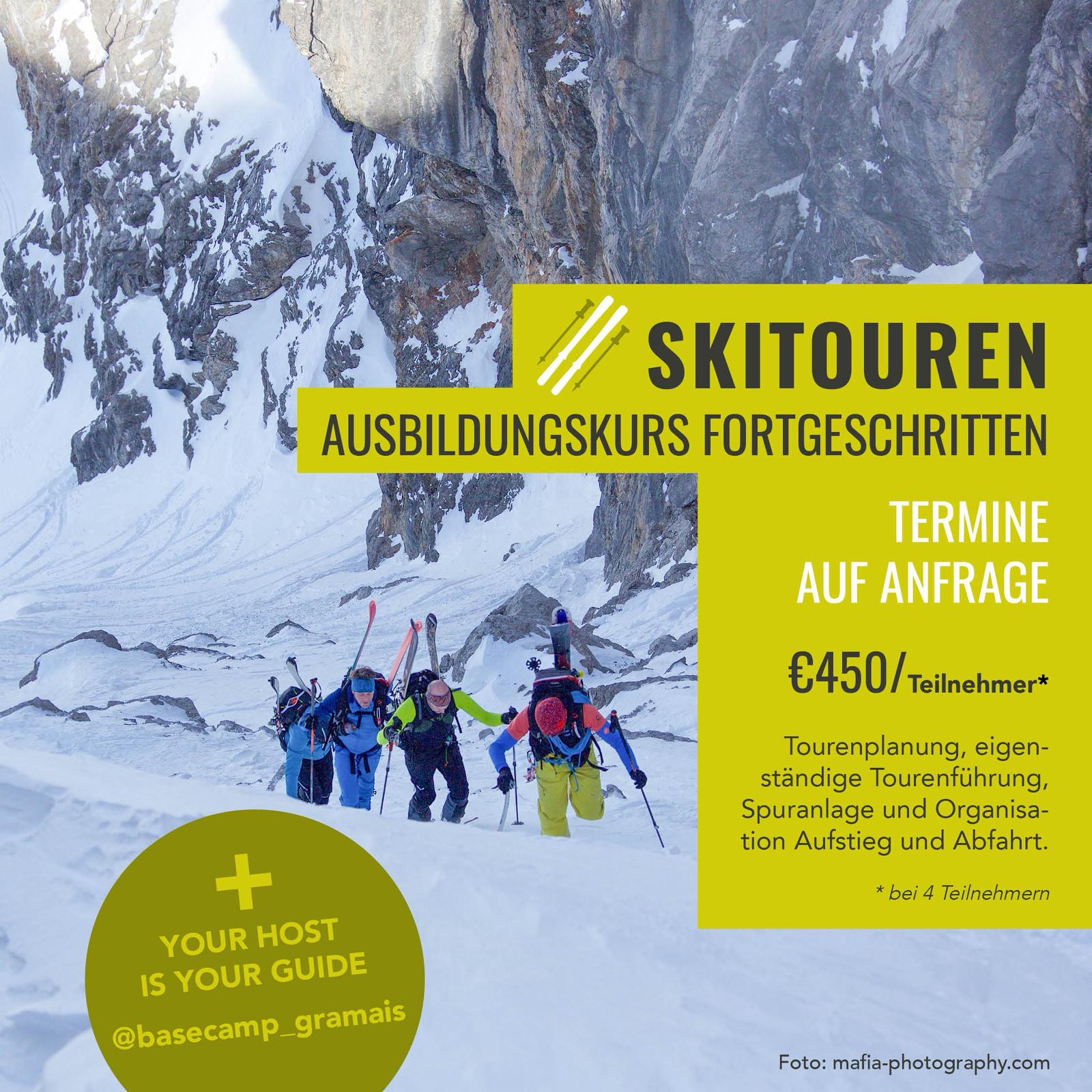 Beginnend bei der Tourenplanung gehen wir mit euch Schritt für Schritt tiefer in die Materie. Fachlich gesehen kommen zwar „nur“ die Seiltechnik und die eigenständige Tourenführung hinzu, jedoch ergibt sich bei dieser Ausbildung eine wesentlich höhere Gesamtanforderung an die Teilnehmer im Vergleich zur Skitourenausbildung für Einsteiger: Konditionell, aufstiegs- und fahrtechnisch, alpinistisch und zu guter Letzt werden wir in unseren menschlichen Eigenschaften als Führungskraft gefordert.